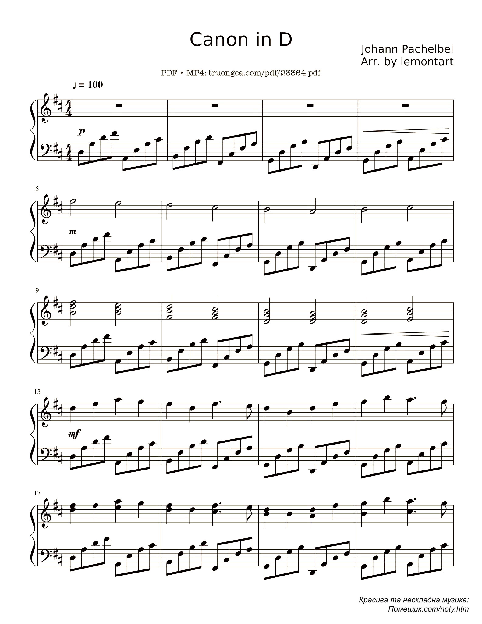 Дуже люблю Canon in D Johann Pachelbel, особливо у виконанні струнного квартету. У мене є ноти для фортепіано, але я ніяк не можу його здолати далі першої сторінки. Тому знайшла полегшену версію: